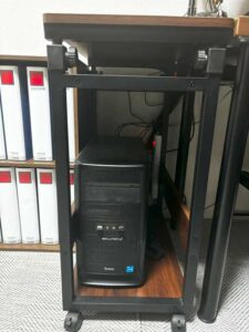 ただパソコンの本体を床に置くと埃や湿気の問題もあり、床の上の位置に置くように考え、いろいろと調べてパソコンワゴンを使うことにしました。天板が昇降してデスクの高さを合わせれば、作業範囲を広げることもできると考えました。