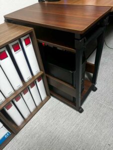天板部分が昇降させることができるので、天板部分を調整して、使用しているデスクとワゴンの天板の高さを合わせました。天板分(35cm)の作業スペースが広がったので作業がやりやすくなりました。主に書類を置いたり、一時的に物を置いたりして、余白を持たせるためのスペースになっています。