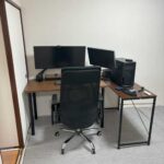 写真を見ている限りだと管理者が使用しているデスクはL字デスクに見えるのですが、実は横に長いデスクを2つ並べて、L字デスクにしていました。デスクの上にデスクトップパソコンの本体を置いていたので、少し窮屈な状態でした。
